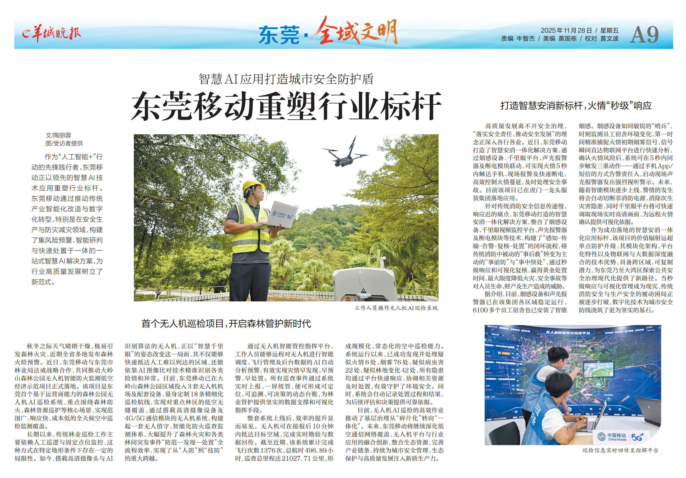 目前,无人机AI巡检的高效作业推动了基层治理从“碎片化”转向“一体化”。未来,东莞移动将继续深化低空通信网络覆盖、无人机平台与行业应用的融合创新,整合生态资源,完善产业链条,持续为城市安全管理、生态保护与高质量发展注入新质生产力。